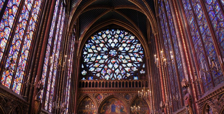 Chapel Sainte-Chapelle was commissioned by King Louis the Ninth in 1248. The beautiful purple-pink windows is what typifies the imposing building. Consequently, these windows create a spectacle of light as soon as you enter the building.